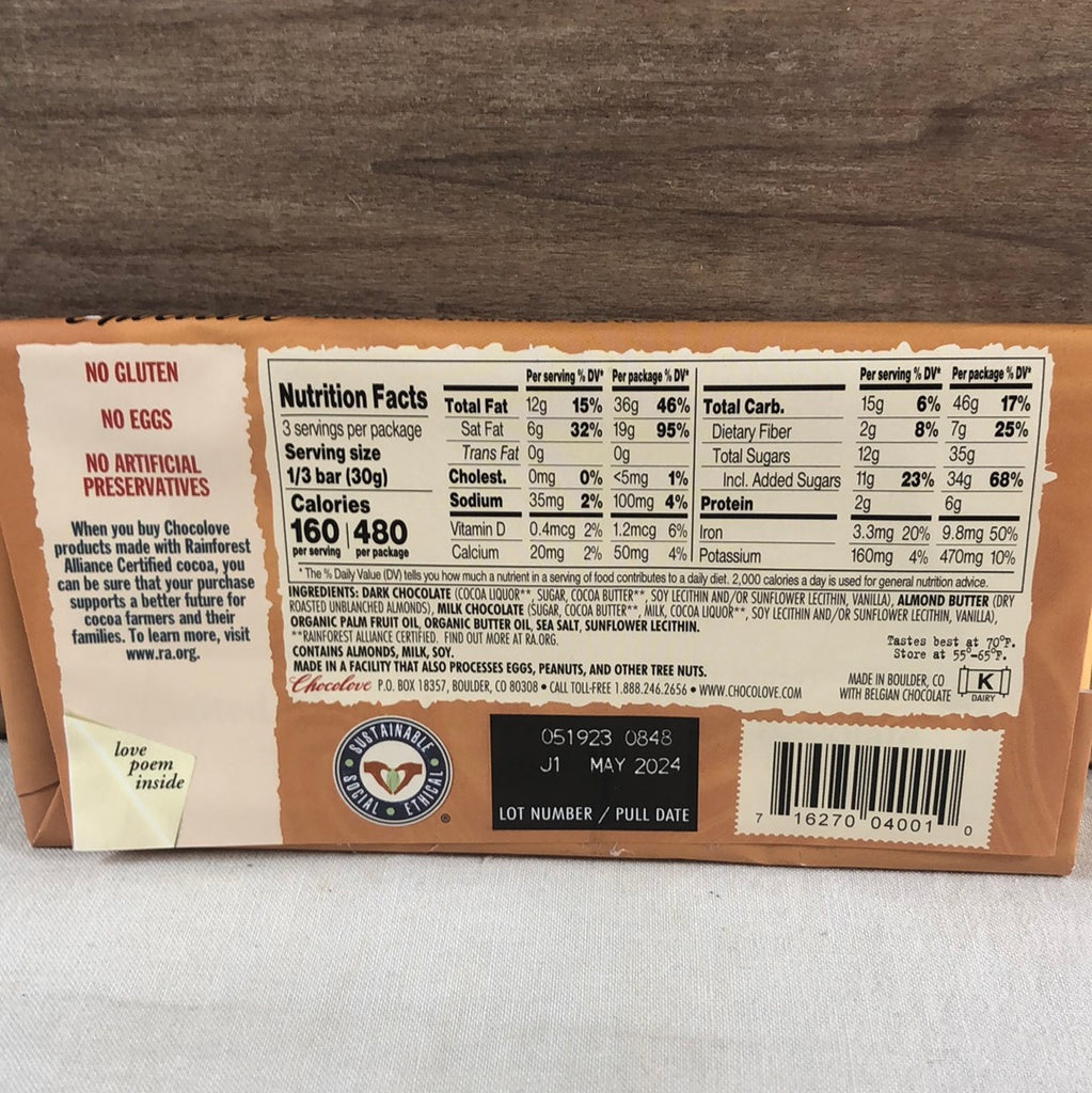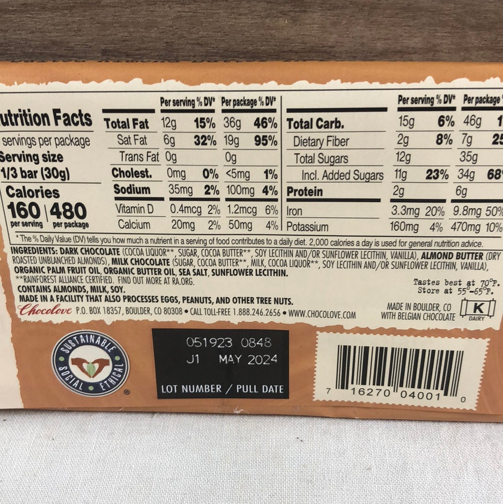 Almond butter and sea salt in Belgian dark chocolate crafted from African cocoa beans. Creamy semisweet dark chocolate and salted almond butter playfully combine in a familiar, yet unique, balance of sweet and savory.