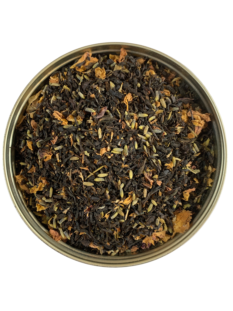 A bright black tea with lavender petals and flavored with blueberry, acai and rose