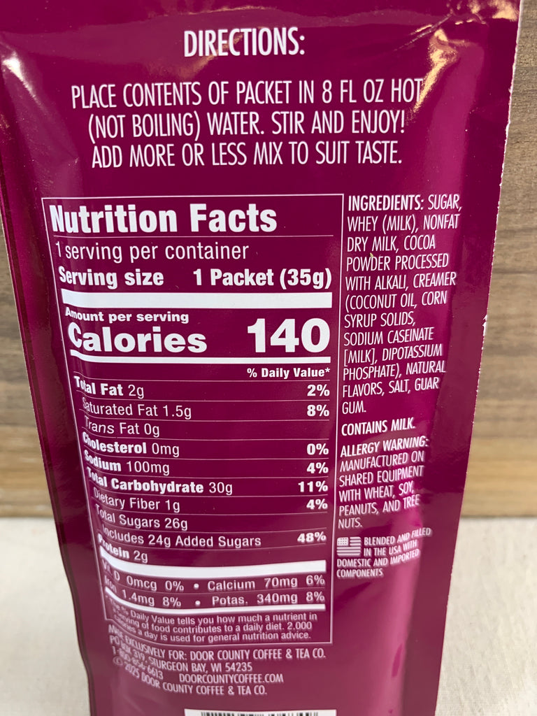 Ingredients: Sugar, whey, nonfat dry milk, Dutch cocoa powder, creamer (syrup solids, sodium caseinate, dipotassium phosphate), natural and artificial flavor, salt, guar gum
