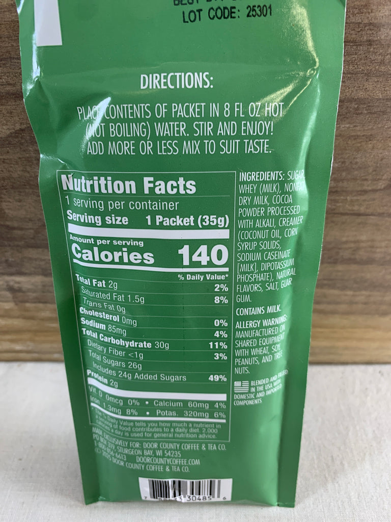 Ingredients: Sugar, whey, nonfat dry milk, Dutch cocoa powder, creamer (syrup solids, sodium caseinate, dipotassium phosphate), natural and artificial flavor, salt, guar gum