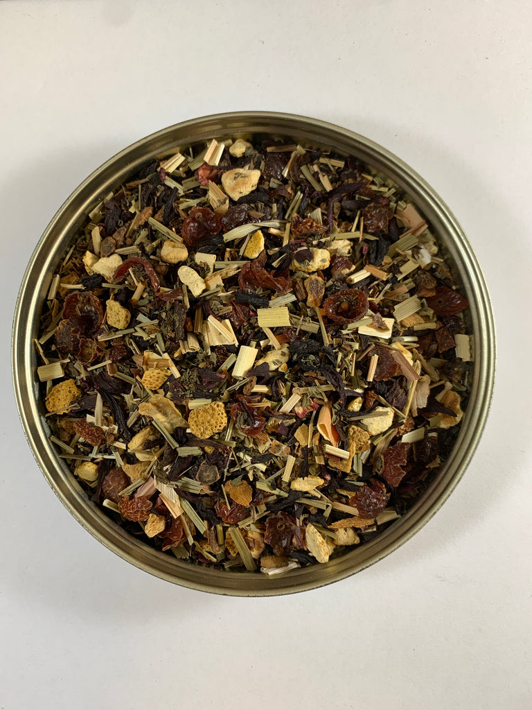 A caffeine-free herbal tisane blend of hibiscus, rose hips, peppermint, orange peel, wild cherry bark and lemon grass.