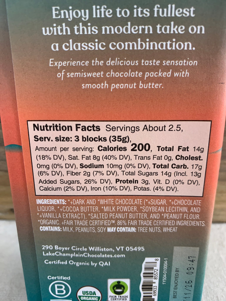 A classy, modern version of 57% dark chocolate and a layer of peanut butter filling. Certified organic.