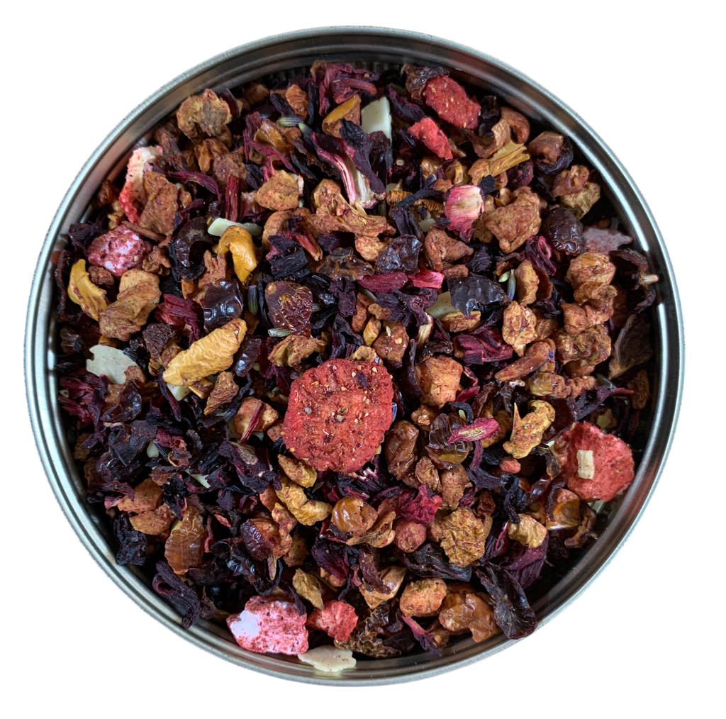 Apple pieces, hibiscus blossoms, rose hip peel, sliced almonds, almond pieces, flavoring, freeze dried strawberry pieces, freeze dried strawberry slices, lavender, freeze dried strawberry yogurt granules, (tapioca starch, strawberries, natural flavoring, black carrot juice concentrate, citric acid)